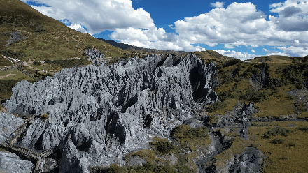 这里的石林,就像上帝洒落在人间的颜料盒 ,春季呈浅灰色、浅蓝色,恍如新生 ,夏秋两季呈苍黑色的石林,宛如堆积如山的银子 。