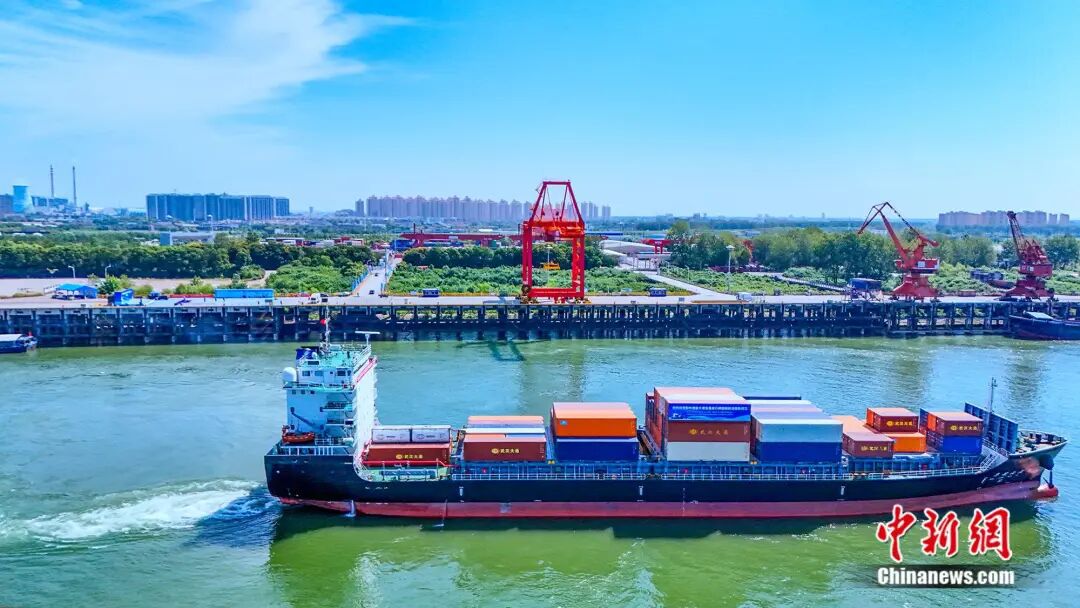 图为8月25日,湖北荆州港盐卡港区直航日韩国际航线正式首航。张梦瑶 摄